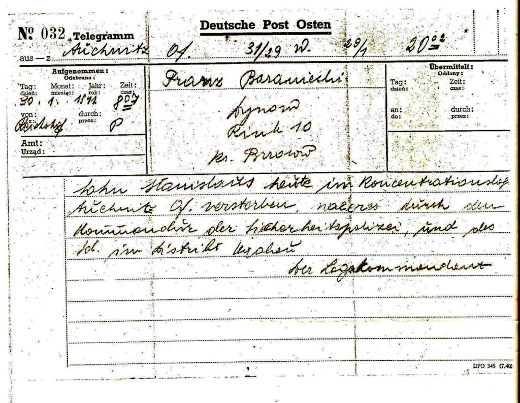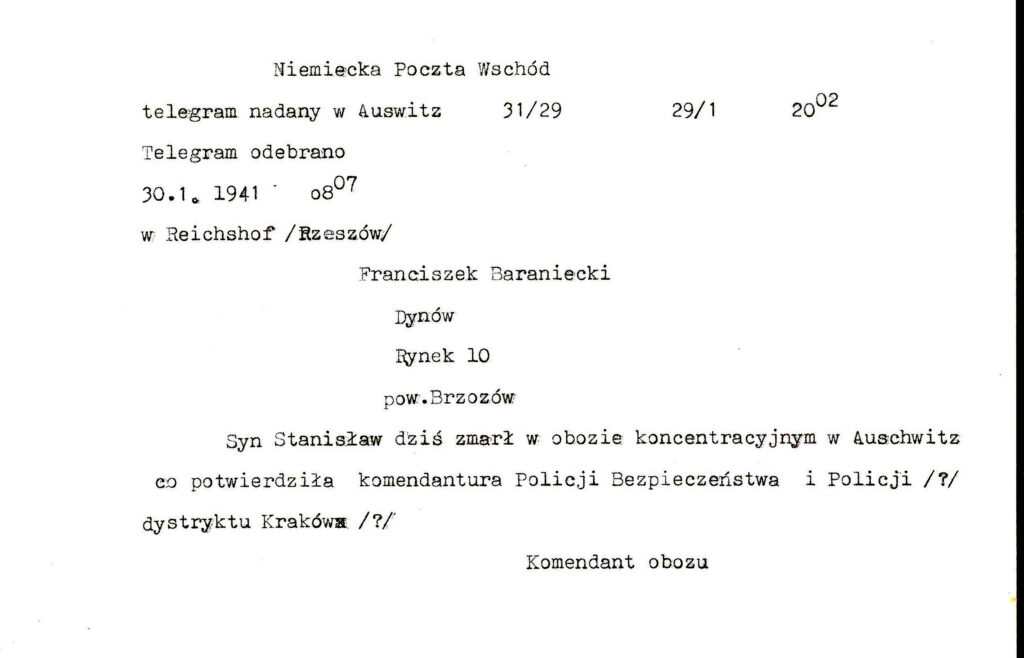 Co „przeskrobał?”, czym się naraził kapo? Ostatecznie, według relacji Władysława Fuksy i Tadeusza Krupińskiego, znajdujących się archiwum muzeum oświęcimskiego, został straszliwie pobity, oblewany wodą na mrozie i w mękach zmarł. Było to 27 stycznia 1941 r. Rodzice dostali telegram dwa dni później. Przerażenie, rozpacz, niewiedza…